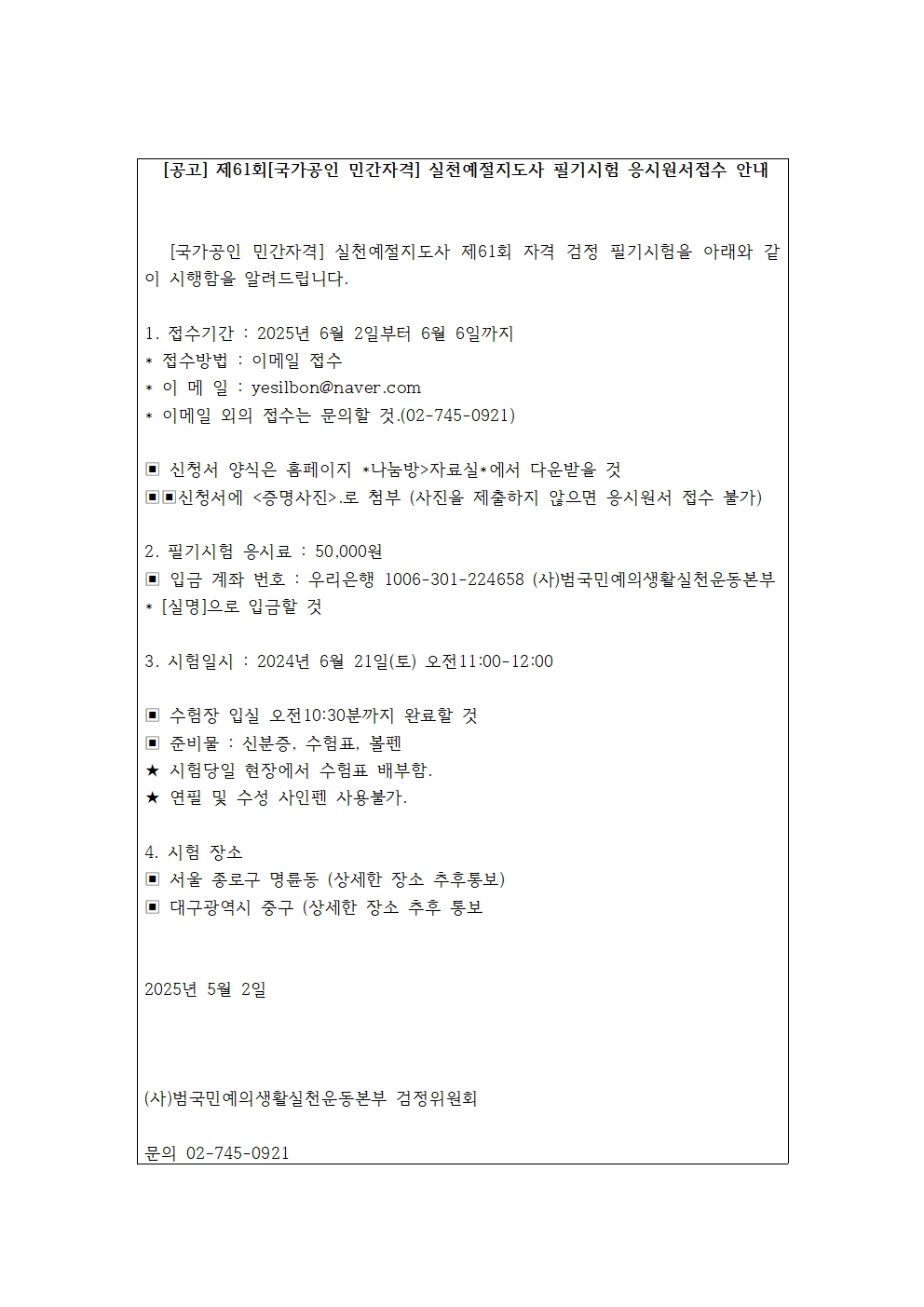 [°ø°í] Á¦61ȸ[±¹°¡°øÀÎ ¹Î°£ÀÚ°Ý] ½Çõ¿¹ÀýÁöµµ»ç Çʱâ½ÃÇè ÀÀ½Ã¿ø¼Á¢¼ö ¾È³»