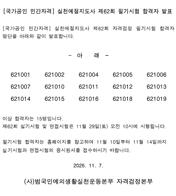 [±¹°¡°øÀÎ ¹Î°£ÀÚ°Ý] ½Çõ¿¹ÀýÁöµµ»ç Á¦62ȸ Çʱâ½ÃÇè ÇÕ°ÝÀÚ ¹ßÇ¥ |
