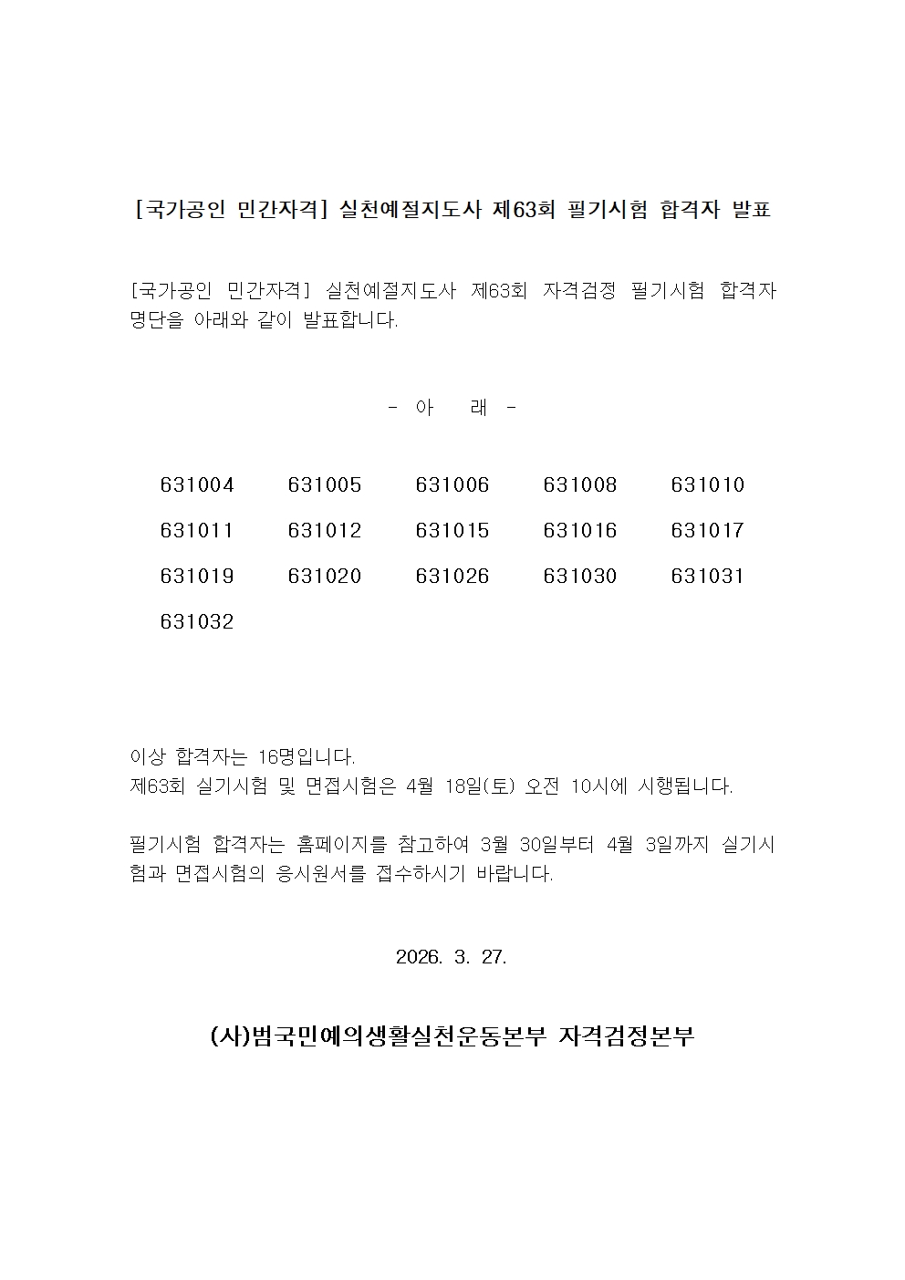 [±¹°¡°øÀÎ ¹Î°£ÀÚ°Ý] ½Çõ¿¹ÀýÁöµµ»ç Á¦63ȸ ÀڰݰËÁ¤ Çʱâ½ÃÇè ÇÕ°ÝÀÚ ¸í´ÜÀ» ¾Æ·¡¿Í °°ÀÌ ¹ßÇ¥ÇÕ´Ï´Ù.